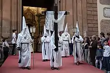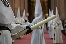 Túnica de tergal blanca con cordón y guantes negros. Llevan el escudo de la institución como escapulario metálico. El blanco representa el color del luto hebreo. Al ser una cofradía de estilo de silencio, tanto penitentes, como mayordomos y estantes disponen del mismo tipo de vestimenta con la cara tapada y la túnica larga.