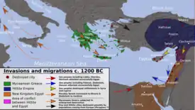 Después de la aparente supervivencia por un tiempo, el Imperio egipcio colapsó a mediados del siglo XII a. C. (durante el reinado de Ramsés VI, 1145-1137 a. C.). Anteriormente, la Estela de Merenptah (c 1200 a. C.) hablaba de ataques de los habitantes de Putria (de la moderna Libia), con ayuda de personas de cinco pueblos: Ekwesh, Shekelesh, Lukka, Shirdana y Teresh[18] y una revuelta cananea en las ciudades de Ascalón, Yenoam y entre el pueblo de Israel. Un segundo ataque durante el octavo año del reinado de Ramsés III involucró a Peleset, Tjeker, Shirdana, Denyen y Weshesh.[19]