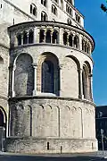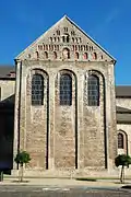 Este ábside occidental se adosa al macizo barlong para terminar bellamente la iglesia en el oeste. Tiene tres pisos apoyados en una fuerte base, separados entre sí por cordones de piedra: el primer piso, ciego, está adornado con bandas lombardas y lesenas; el segundo está recorrido por una arcada en la que alternan los huecos ciegos y ventanas, separados por pequeñas columnas que confieren al contra-ábside un hermoso impulso vertical; el tercer y último piso está adornado con una galería enana compuesta de tripletes de huecos de medio punto coronados por mampuestos tallados tanto con motivos geométricos como antropomórficos.