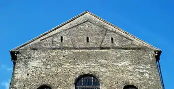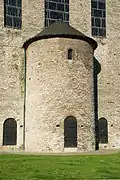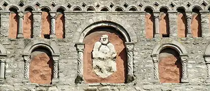 El macizo barlong (barlongo, es decir, «alargado transversalmente») presenta cinco niveles de alturas desiguales, separados por poderosos cordones de piedra. El nivel inferior está atravesado por dos porches curvos dispuestos a cada lado del contra-ábside. El segundo nivel está atravesado por dos ventanas en trébol mientras que el tercer nivel es ciego. El cuarto nivel está perforado con numerosos huecos geminados con columnillas dispuestas en dos niveles, mientras que el quinto y último nivel presenta una ornamentación de siete grupos de tres huecos.