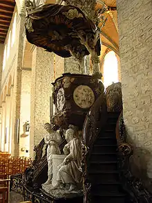 - púlpito de la colegiata (1772), en mármol y madera, con Jesús y la Samaritana conversando en el pozo de Jacob. Los tres medallones ilustran las parábolas del del sembrador, del hijo pródigo y del padre de familia. La superestructura de estilo barroco y las decoraciones de la barrica y las escaleras de estilo Luis XVI viven en armonía en un impresionante conjunto. Laurent Delvaux fue asistido por Philippe Lelièvre (decorador escultor) y Nicolas Bonete (ebanista);[5]: 15–6