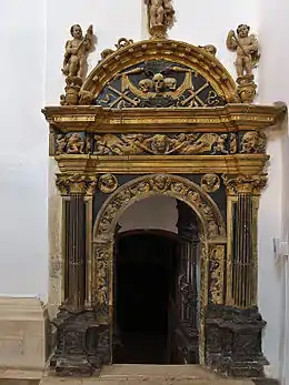 El patio de entrada, independiente del conjunto de la colegiata, responde a los modelos de la arquitectura doméstica de la época, que por razón de la carga simbólica de sus inscripciones, frescos y relieves de sus yeserías se convierte en uno de los conjuntos funerarios más representativos del nuevo estilo clasicista y de la mentalidad humanista de las casas señoriales de Andalucía.