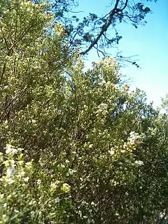 Es un arbusto erecto, muy ramificado y compacto que crece hasta una altura de 2 m. Está finamente ramificado y desarrolla nuevos brotes en las puntas de las ramas viejas. La ramificación se produce a partir de la base del arbusto. La corteza es de color marrón grisáceo, dura con cicatrices horizontales de las hojas. La inflorescencia es solitaria, axilar y densa en la punta de las ramas. Los capullos cerrados de flores se tiñen de color rosado y aparecen en blanco cuando se abren. Las flores son pequeñas, blancas de 6-7 mm de diámetro, con un disco de color verde oscuro en el centro. Las flores aparecen con tal profusión que la selva es una nube blanca cuando está en flor y atrae a las abejas y mariposas. Florece de mayo a noviembre.[2]