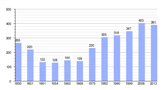 Los datos demográficos contemplados en este gráfico de la comuna de Colomby-sur-Thaon[4] se han cogido de 1800 a 1999 de la página francesa EHESS/Cassini, y los demás datos de la página del INSEE.[5]