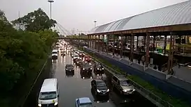 ![]() Perspectiva de la Calzada Ignacio Zaragoza dirección sur, una de las vialidades primarias que atraviesan la colonia Agrícola Oriental, al oriente de la capital mexicana. A la derecha, estación de Metro del mismo nombre. | ||