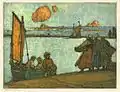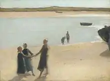 El único pintor inglés importante relacionado con Étaples fue Philip Wilson Steer, quien pasó algún tiempo allí en 1887. Su brumoso estilo impresionista llama la atención en pinturas como "La playa" (Galería 4) y "Los niños pescadores". [65] Otra obra para la que ciertamente hizo un estudio preliminar mientras estuvo allí, "El puente", ahora se considera que fue pintada en Walberswick, la ciudad del estuario inglés a la que se mudó a continuación. [66] Dudley Hardy (1866–1922) capturó un efecto vespertino en una acuarela de 1888, mirando desde el lado sur del Canche y mostrando los molinos de viento que dominaban la ciudad en ese período. [67] Nora Cundell (1889-1948) nos lleva al salón trasero del Café Loos, a través de cuya puerta se pueden ver algunos tipos de artistas en la mesa. [68]