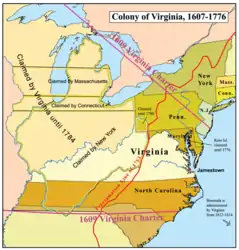 La colonia de Virginia, cartografiada en 1606 y asentada en 1607, fue el primer asentamiento permanente inglés en Norteamérica, después de varios intentos fallidos en Terranova —a cargo de Humphrey Gilbert[1] en 1583— y en la isla Roanoke por Walter Raleigh a finales de la misma década.