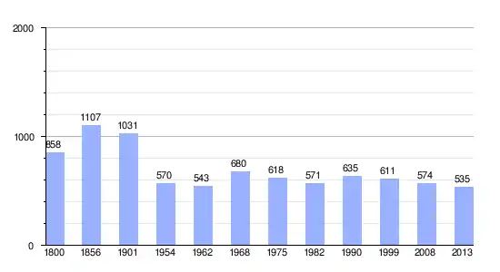 Los datos demográficos contemplados en este gráfico de la comuna de Colroy-la-Grande[4] se han cogido de 1800 a 1999 de la página francesa EHESS/Cassini, y los demás datos de la página del INSEE.[5]