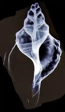 - Imagen de dos conchas seccionadas que muestran la columela