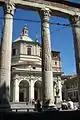 Hay dieciséis columnas, de unos 7,5 metros de altura, de mármol de Musso, con capiteles corintios que sostienen el entablamento. De hecho, mirando de cerca las columnas hay 17, y en la parte superior del arco en el centro de las columnas, que diferencia 8 de un lado y 8 del otro, hay una columna en miniatura con una cruz en la parte superior. Proceden de edificios romanos del siglo II o III, probablemente de un templo pagano situado en la zona de la actual plaza de Santa María Beltrade.[1]