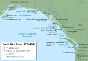 La entrada de Rusia en la Costa Noroeste, más allá del Prince William Sound, fue lenta debido a la escasez de barcos y marineros. En 1794 alcanzaron Yakutat Bay y en 1795 se construyó el asentamiento de Slavorossiya, originalmente destinado a ser la capital colonial.[59] James Shields, un empleado británico de la Compañía Golikov-Shelikhov, reconoció la costa hasta las islas de la Reina Carlota. En 1795, Alexander Baranov navegó en el Sitka Sound, reclamándolo para Rusia. Las partidas de caza llegaron en los años siguientes. En 1800, tres cuartas partes de las pieles de nutria marina de la Compañía Ruso-americana provenían de la zona de Sitka, ascendiendo a varios miles cada año. En el Sitka Sound fue también donde surgió por primera vez la competencia seria entre rusos, británicos y estadounidenses.[60] En julio de 1799, Baranov regresó en el bergantín Oryol y estableció el asentamiento de Arkhangelsk, también conocido como Fuerte Arcángel Gabriel.[61][62] En junio de 1802, guerreros tlingit atacaron el asentamiento y mataron y capturaron a la mayoría de los 150 rusos y aleutianos que vivían allí.[63] Baranov dirigió una expedición armada para retomar Sitka por la fuerza en junio de 1804. El buque de guerra ruso Neva se unió a Baranov en Sitka. Se estableció una nueva fortaleza rusa mientras los tlingit se aprestaban a defenderse con un fuerte propio bien armado. La tensión subió rápidamente con varias escaramuzas y las negociaciones se rompieron. A principios de octubre, los rusos atacaron el fuerte tTlingit con cañones desde el Neva y desde una partida por tierra. Los tlingit respondieron con armas de gran alcance y fuego de cañón desde el suyo. La batalla de Sitka, como se conoce, continuó durante varios días hasta que los tlingit abandonaron su fuerte y salieron de la zona.[63] Los relatos tlingit de la batalla se niegan a admitir la derrota o dar el crédito a los rusos de la toma de la fortaleza tlingit.[64] Los rusos destruyeron el abandonado fuerte tlingit y nombraron su nuevo fuerte como Novo-Arkhangelsk, también conocido como Fuerte Arcángel Miguel o Fuerte de San Miguel.[61] Los enfrentamientos en Sitka en 1802 y 1804 desempeñaron un papel importante en las posteriores relaciones ruso-tlingit durante generaciones.[64]