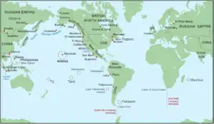 La Compañía Ruso-americana (RAC) se constituyó en 1799, poniendo fin al período promyshlenniki y dando comienzo a una era de monopolio centralizado.[65]Su carta de fundación fue establecida en 1799 mediante un ucase del nuevo zar Pablo I de Rusia, que concedió a la empresa el control monopolistico sobre el comercio en las islas Aleutianas y el territorio continental de América del Norte, llegando por el sur hasta los 55°N (la latitud, aproximadamente, de la actual frontera en la costa entre la Columbia Británica y Alaska). La RAC se inspiró en la East India Company (EIC) y en la Hudson's Bay Company (HBC). Los funcionarios rusos destinados a la compañía operaban tanto como empleados de una empresa como integrantes de una organización estatal cuyo fin era extender la influencia imperial, al igual que los de la EIC y la HBC. También se esperaba que la empresa pudiera llevar a cabo el comercio marítimo con China y Japón, aunque este objetivo no se cumplió.[66] En 1818 el gobierno ruso tomó el control de la RAC, sustituyendo a los comerciantes que tenían la carta. El explorador y oficial naval Ferdinand Petrovich von Wrangel fue el primer presidente de la compañía durante la nueva etapa gubernamental. En 1867, la compra de Alaska transfirió el control de Alaska a los Estados Unidos y los intereses comerciales de la Compañía Ruso-americana se vendieron a la Hutchinson, Kohl & Company de San Francisco, que luego se fusionó con otros grupos para formar la Compañía Comercial de Alaska (Alaska Commercial Company).[47]