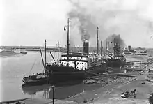 - SS Yochow ( 2,810 construido en 1938 estuvo involucrado en los primeros esfuerzos de la guerra del Pacífico para abastecer a las Indias Orientales de Filipinas y los Países Bajos desde Australia y luego funcionó bajo el control del Ejército de los EE. UU. Como parte de la flota local permanente del Área del Pacífico Sudoccidental como X-7 desde el 11 de abril de 1942 hasta diciembre de 1945.) [14] [15]