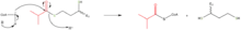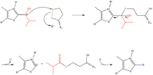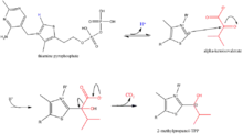 PASO 1: la α-cetoisovalerato se combina con TPP y es entonces descarboxilada.[22] El mecanismo que empuja la dirección de la flecha se muestra en la Figura 3. PASO 2: El 2-metilpropanol-TPP es oxidado para formar un grupo acilo, mientras que es simultáneamente transferido al cofactor lipoil en la subunidad E2.[22] Es de notar que en este paso el TPP es regenerado. El mecanismo que empuja la dirección de la flecha se muestra en la Figura 4.