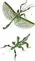 - Una ilustración de 1833 por George Robert Gray de un fásmido, mostrando su postura de cripsis y la exhibición dramática de sus alas.