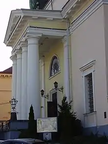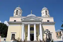 El templo fue construido entre los años 1817 y 1842 en una planta cruciforme, con una cúpula en la intersección de los pasillos en el estilo de clasicismo. La iglesia se encuentra en el antiguo emplazamiento de un comerciante polaco y cerca de la Plaza de la Independencia y la Puerta Lacka.