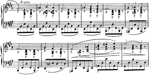 Los compases de apertura, que constituyen el primer tema, están marcados como "quasi-trombe" (como las trompetas). Tales marcas aparecen con frecuencia a lo largo de la partitura para indicar el instrumento orquestal que se supone que evoca el pianista. Después de que se expone este tema, comienza el segundo tema contrastante y más lírico. Este segundo tema se usa como contraste tanto con el primer tema en sí mismo como, más en general, con cualquier pasaje virtuoso difícil.
