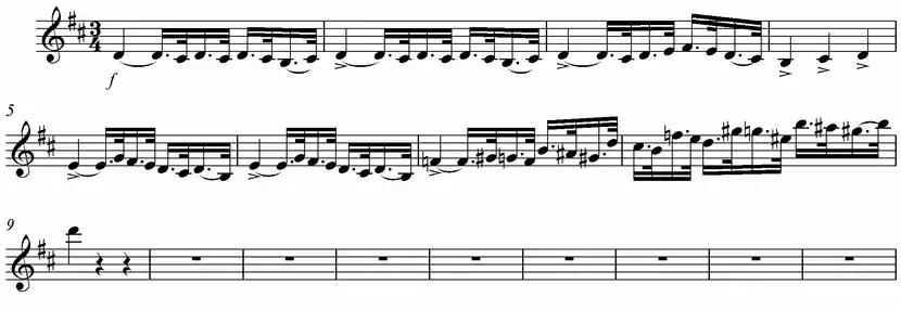 Como si el tercer movimiento volviese a comenzar y todo lo anterior fuera solo una prueba. El solista tiene a partir de este momento compases en los que se necesita brío y energía. Y es entonces cuando empiezan las frases cromáticas que llevan a una fanfarria fingida por parte de los metales. A partir de esos momentos el violín se mueve en cascada para terminar en una nota sola. El concierto ha terminado.