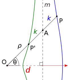 Haciendo coincidir el punto con el origen de un sistema de ejes cartesianos ; y tomando una recta base paralela al eje a una distancia d del origen, y una distancia k a aplicar sobre los radios vectores, la ecuación cartesiana de la curva es: