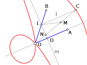 - Se determina el punto P como la intersección de la concoide con la recta OA. La recta PB corta a la recta OC en el punto M