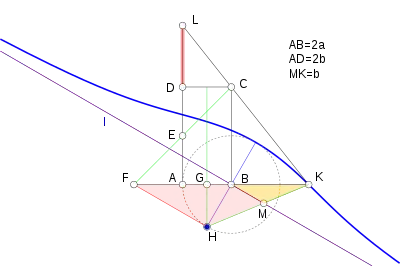 - Ahora, se construye la rama exterior de una concoide de Nicomedes con el punto G como polo, la recta (L) como recta base y la distancia a