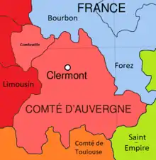 - El delfinado de Auvernia, resultante de la bipartición del condado de Auvernia después de la guerra de sucesión de Auvernia.