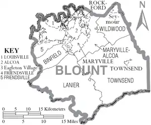 - Esta obra contiene una traducción derivada de «Blount County, Tennessee» de Wikipedia en inglés, publicada por sus editores bajo la Licencia de documentación libre de GNU y la Licencia Creative Commons Atribución-CompartirIgual 3.0 Unported.