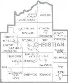 El condado de Christian se separó de los condados de Sangamon, Montgomery y Shelby en 1839. Originalmente su nombre fue condado de Dane, pero en 1840 le cambiaron el nombre en honor de William Christian, un nativo del condado de Augusta de Virginia y veterano de Guerra de Independencia de los Estados Unidos.
