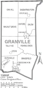 • Esta obra contiene una traducción derivada de «Granville County, North Carolina» de Wikipedia en inglés, publicada por sus editores bajo la Licencia de documentación libre de GNU y la Licencia Creative Commons Atribución-CompartirIgual 3.0 Unported.