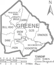 El condado se divide en nueve municipios: Municipio de Bull Head, Municipio de Carrs, Municipio de Hookerton, Municipio de Jason, Municipio de Olds, Municipio de Ormonds, Municipio de Shine, Municipio de Snow Hill y Municipio de Speights Bridge.