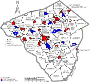 Brickerville | Clay | East Earl | Gap | Landisville | Leola | Leacock-Leola-Bareville | Little Britain | Maytown | Paradise | Reamstown | Rheems | Rothsville | Salunga | Salunga-Landisville (histórico) | Swartzville | Willow Street | Witmer