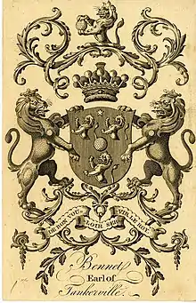 Ex libris mostrando las armas de los condes de Tankerville (tercera creación): Gules, un besante entre tres medio leones rampantes en argent. Cresta - Una doble escalera de oro. Otra cresta - Fuera de una corona mural oro, la cabeza de un león de gules sobre el cuello un besante. Apoyos - Dos leones en argent con corona ducal, cada uno cargado en el hombro con un roel. Lema - De bon vouloir servir le roy. [1]