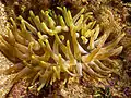 Como la mayoría de las anémonas marinas posee algas simbiontes, llamadas zooxantelas. Las algas realizan la fotosíntesis produciendo oxígeno y azúcares, que son aprovechados por las anémonas, y se alimentan de los catabolitos de la anémona (especialmente fósforo y nitrógeno).[7] No obstante, las anémonas se alimentan tanto de los productos que generan estas algas, entre un 75 y un 90 %, como de las presas de zooplancton o peces, que capturan con sus tentáculos.