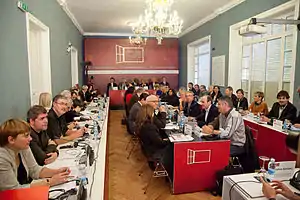- Rosa Díez, portavoz de Unión Progreso y Democracia (UPyD), se mostró "aterrada" porque, en su opinión, el PSOE y el Gobierno, que consideraba "de los suyos", se sumaron a la estrategia de ETA al respaldar la Conferencia. "Cuando ETA lo deje, que lo dejará, no será porque se han juntado una docena de mediadores, sino que será consecuencia de un esfuerzo conjunto de fuerzas de seguridad del Estado, jueces y de la propia sociedad", declaró.[8] Por su parte, el portavoz de UPyD en el Parlamento Vasco, Gorka Maneiro, consideró que la conferencia era "juez y parte del entramado batasuno" y añadió que era "una broma de mal gusto, un disparate y un circo al servicio de los que no quieren un final de ETA con vencedores y vencidos".[12]