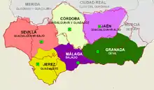 - Provincias de segundo orden: aquellas que carecían de subdivisión interna. En Andalucía el resto de las provincias: Córdoba, Jaén, Cádiz y Málaga.
