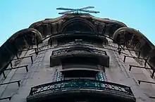 Aún pueden verse en el frente las aspas de un molino de fantasía y justo encima de él se alza la imponente cúpula en aguja, que fue cerrada con vitrales Art Noveau multicolores.