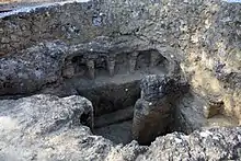 - Ustrinum. Fosa rectangular excavada en la roca, con otra cavidad rectangular en la parte central. Estaba destinada a la incineración del difunto, aunque acabó siendo usada como tumba. En su interior aparece una urna con las cenizas del difunto y su correspondiente ajuar funerario, así como una cubierta de tejas o losas de piedras. El exterior de la tumba se señalizaba con estelas.
