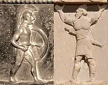 Soldados indios de los tres territorios de Gándara, Sattagydia (Tathagatus) y Hindush, junto con soldados de todas las demás naciones, apoyan el trono de su gobernante aqueménida, en Naqsh-e Rostam en las tumbas de Darío I, Jerjes I, Artajerjes I y Darío II, y en Persépolis en las tumbas de Artajerjes II y Artajerjes III. El último gobernante aqueménida, Darío III, nunca tuvo tiempo de terminar su propia tumba debido a su apresurada derrota ante Alejandro Magno, y por lo tanto no tiene tales representaciones.[48][68] Los soldados de la India se caracterizan por su particular vestimenta, compuesta únicamente de una tela de lomo y sandalias, con la parte superior del cuerpo desnudo, a diferencia de todas las demás etnias del ejército aqueménida, que están completamente vestidas, y a diferencia de las provincias vecinas de Bactria o Arachosia, que también están totalmente vestidas.[48]