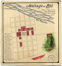 Al llegar al valle de Copiapó, toma en nombre del rey de España esta tierra y la nombra Nueva Extremadura, en recuerdo a su tierra natal. Renueva la marcha hacia el valle del Aconcagua, donde el cacique Michimalonco intentó detenerlo sin éxito. Las muertes a los caciques del Tiwantinsuyu sur, propinadas por Almagro al regresar a Cuzco, precipitaron la conquista del territorio.[1] El 12 de febrero de 1541, echó las bases de la ciudad de Santiago del Nuevo Extremo a los pies del cerro Santa Lucía (Huelén en mapudungún) y encerrada entre los brazos del río Mapocho. Trazó la ciudad en forma de damero, dentro de la isla fluvial dividen todo el terreno en manzanas, que se partieron a la vez en cuatro solares que se asignaron a los primeros vecinos. Al trazado y formación de la ciudad le siguió la creación del primer cabildo, organismo que ordenaba la vida pública en aquel entonces, importando el sistema jurídico e institucional español.