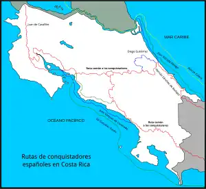 Cristóbal Colón arribó al territorio de la actual Costa Rica el 25 de septiembre de 1502,[19] en su cuarto viaje.[20] La llamó "Veragua" en su "Carta de Jamaica",[20] y dado que logró recoger algunos pocos objetos de oro que obtuvo de los indígenas, se difundió la idea de que esa región era una "costa rica",[21] lo que impulsó a los aventureros a emprender otras exploraciones y sirvió de polo de atracción para los colonizadores por la existencia de esta supuesta riqueza aurífera.