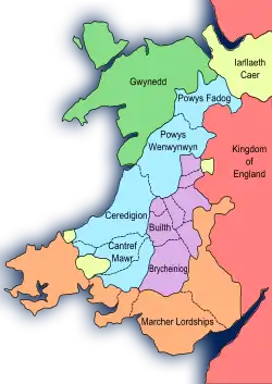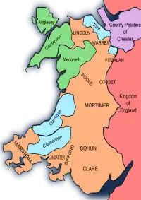 El principado de Gwynedd era el poder dominante en Gales en la primera mitad del siglo XIII, con Powys y Deheubarth convertidos en estado tributario. [3] Los príncipes de Gwynedd asumieron ahora el título de "Príncipe de Gales".[4] Pero la guerra con Inglaterra en 1241 y 1245, seguida de una disputa dinástica en la sucesión al trono debilitó a Gwynedd y permitió a Henry III apoderarse de Perfeddwlad (también conocido como los "Cuatro Cantrefs",[5] la parte oriental del principado). [6][7] Sin embargo, a partir de 1256 un resurgimiento de Gwynedd bajo Llywelyn ap Gruffydd (que llegó a ser conocido como "Llywelyn el Último") reanudó la guerra con Enrique y recuperó Perfeddwlad.[7]Por el Tratado de Montgomery de 1267, se restableció la paz y, a cambio de hacer homenaje al rey inglés, Llywelyn fue reconocido como Príncipe de Gales y su reconquista de Perfeddwlad fue aceptada por Enrique. [8][9] Sin embargo, las guerras esporádicas entre Llywelyn y continuaron algunos de los señores de la marcha, como Gilbert de Clare, Roger Mortimer y Humphrey de Bohun.[10]