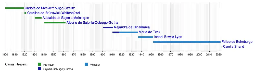 Carolina de Brunswick-Wolfenbüttel | 17 de mayo de 1768 | 8 de abril de 1795 | 29 de enero de 1820 | No coronada | 7 de agosto de 1821 | Jorge IV | |