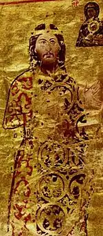 ![]() Miniatura del sebastocrátor Constantino Paleólogo en el manuscrito del Typikon del Convento de la Madre de Dios (Bebaia Elpis), siglo XIV. | ||