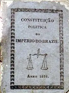 La Carta otorgada en 1824 fue influenciada por las Constituciones francesa de 1791 y española de 1812.[10] Era un "bello documento de liberalismo del tipo francés",[11] con un sistema representativo basado en la teoría de la soberanía nacional.[12] La forma de gobierno era la monárquica, hereditaria, constitucional y representativa, siendo el país subdividido formalmente en provincias y el poder político estaba dividido en cuatro poderes, conforme a la filosofía liberal y a las teorías de la separación de poderes de Benjamin Constant.[10] La Constitución era una de las más liberales que existían en su época,[13][14] incluso superando las europeas.[15] Era más liberal, en diversos puntos, y menos centralizadora que el proyecto de la Constituyente, revelando que los "constituyentes del Primer Imperio, estaban perfectamente actualizados con las ideas de la época".[16][17][18] A pesar de que la Constitución preveía la libertad religiosa, aunque solo en el ámbito doméstico, en la práctica, la libertad era total. Tanto los protestantes, como judíos y seguidores de otras religiones mantuvieron sus templos religiosos y demás actos con completa libertad de culto.[19] Contenía una innovación, que era el Poder Moderador, cuyo surgimiento en la letra de la ley fue atribuida a Martim Francisco de Andrada, un gran admirador de Benjamin Constant Botelho de Magalhães.[20] Este Poder serviría para "resolver impasses y asegurar el funcionamiento del gobierno".[19] La separación entre el Poder Ejecutivo y Moderador surgió a partir de la práctica en el sistema monárquico-parlamentarista británico.[21]