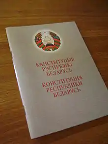 La Constitución de la República de Bielorrusia (en bielorruso, Канстытуцыя Рэспублікі Беларусь, en ruso, Конституция Республики Беларусь) es la ley fundamental de dicho país.[1] Adoptada en 1994, tres años después de que el país declarara su independencia de la Unión Soviética, este documento formal establece el marco del estado bielorruso y el gobierno y enumera los derechos y las libertades de los ciudadanos. La Constitución fue elaborada por el Sóviet Supremo de Bielorrusia, el antiguo cuerpo legislativo del país, para cuya redacción se consultó a la ciudadanía y a expertos legales. Los contenidos de la Constitución incluyen el preámbulo, nueve secciones, y 146 artículos.[2]