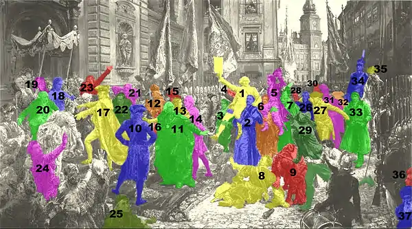 Entre el grupo de personas que se arremolinan en la esquina inferior izquierda del cuadro se identifican otras figuras de importancia entre la burguesía: Jan Kiliński (24), uno de los líderes de la Insurrección de Kościuszko[27] y, a su derecha, a un lado del grupo, el santo Clemente María Hofbauer (25), director de un orfanato y una escuela en Varsovia.[18]