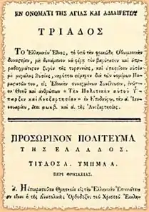 A finales de la Edad Media, Grecia fue conquistada por los otomanos y no fue sino hasta el siglo XIX cuando se empezó un largo proceso de independencia que culminó en 1829.[10][11][12]El primer intento de constitución de dio durante los primeros alzamientos griegos de 1820.[13] El 1 de enero de 1822, ante los representantes del Peloponeso y otras regiones de la Hélade —incluyendo algunas islas del egeo— se dio a conocer el primer texto de carácter constitucional de la Grecia moderna en la Asamblea de Epidauro.[14][15] Este fue conocido como la Constitución temporal de Grecia,[Nota 2] inspirada fuertemente por los principios liberales y modelado con base en la declaración francesa de los derechos del hombre y del ciudadano.[17][18] Esta dividía el poder del estado en tres órganos —legislativo, ejecutivo y judicial—, y junto a las constituciones de 1823 y 1827, fueron las bases de la primera República helénica.[16][19]