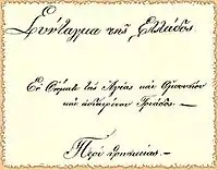 Entre los principales decretos de estas se encontraban la libertad de prensa, el derecho al honor y la seguridad, abolición de la esclavitud y sobre todo la soberanía popular en el artículo 5 de la constitución de 1827 o de Trezena.[20][21]Sin embargo, todo los avances logrados durante el proceso independentista griego fueron suspendidos por el gobernador Ioannis Capodistria,[22][Nota 3] así el 30 de enero de 1828 el parlamento y gobernó junto al Panhelenion (una institución a modo de senado consultivo formada por 27 miembros),[24][25]Grecia entonces entró en periodo de férreo absolutismo.[26] Esto causó un gran descontento entre los griegos y en mayo se produjeron varios levantamiento en Mani Occidental y otras ciudades del Peloponeso.[27] Pero la sublevación fue aplastada rápidamente por el gobernador, que encarceló a Pedro Mavromijalis por ser, según él, incitador de la rebelión. Al verse la oposición incapaz de derrotar a Capodistria, planearon asesinarlo, y el 9 de octubre fue llevado a cabo por Constantino y Yorgos Mavromijalis —hijo y sobrino de Pedro respectivamente— frente a la Iglesia de San Espiridón,[28] en Nauplia —por entonces la capital provisional de la república—,[Nota 4]causando gran alegría entre griegos, pero dejando un vacío gubernamental.[Nota 5][33][34]
