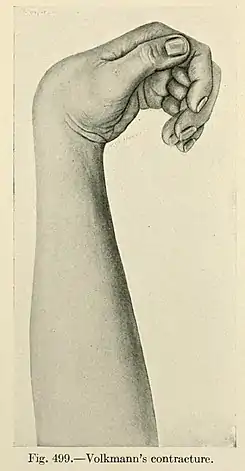La contractura de Volkmann es una contractura de flexión permanente de la mano a nivel de la muñeca, que da lugar a una deformidad en forma de garra de la mano y los dedos. La extensión pasiva de los dedos está restringida y es dolorosa.[1][2]