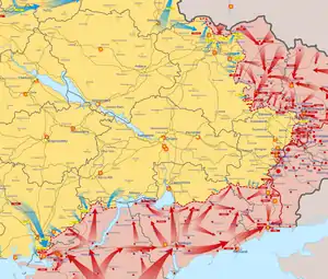 Durante la invasión rusa de Ucrania, las tropas rusas invadieron los óblasts de Jersón, Zaporiyia y Nicolaiev durante la ofensiva del sur de Ucrania. Las tropas rusas capturaron la capital homónima de Jersón[3] con facilidad y empujaron a las tropas ucranianas de regreso a la ciudad de Nicolaiev en un intento de llegar a Odesa desde el sureste.[4][5] En el óblast de Zaporiyia, las tropas rusas avanzaron hacia el norte y finalmente derrotaron a los militares ucranianos en el sitio de Energodar, y se apoderaron de la valiosa central nuclear de Zaporiyia.[6] Las fuerzas rusas también avanzaron hacia el este, alcanzando las fronteras administrativas de los óblasts de Donetsk y Zaporiyia.